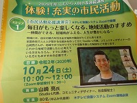 | オンライン学舎 「THEコミュニティ」 2月2日(水) 19時から 10人参加 こんな時こそオンライン、こんな時こそ話そう! けやきで楽しむ、けやきを楽しむ ①Wi-Fiをベースにした新しいコミュニティ活動の実行 ②コミセン内に閉じこもらないで、外に出る活動の実行 ③コミュニティ構想と「自主三原則」のお勉強 次回お楽しみに~ |