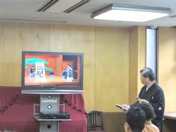 ビデオ「安達原」を鑑賞しながら、言葉の意味、所作、舞台の解説を聞く。地謡、会話の一部を全員で朗誦。普遍的な人間の悲しさ時には、鬼にもなるという内容を描いている。
